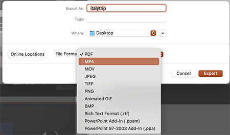 5. To save your presentation as a movie: click File --> Export, then change the File Format to MP4: