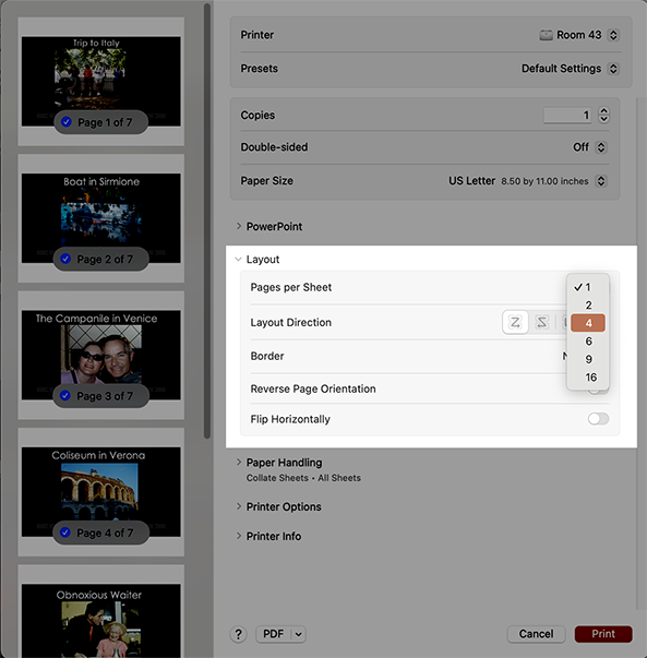3. To print four pages on one, click Layout, and then select 4 pages per sheet: