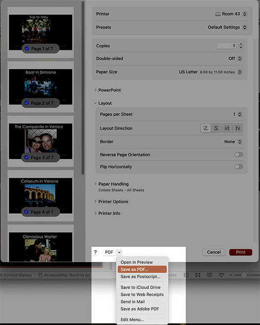4. Click PDF, then Save as PDF. Save it to your desktop.