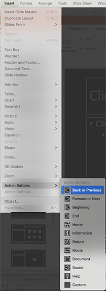 3. Click on Insert--> Action Buttons --> Back or Previous.